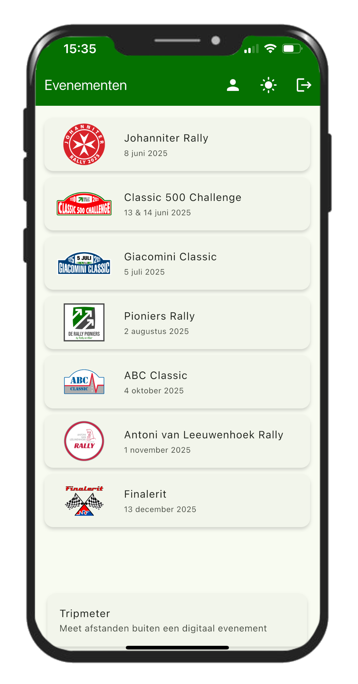 Veel van onze evenementen worden verreden met onze eigen Rally en Meer App. Naast het verzamelen van controles is de app ook de centrale plek voor uitslagen, inschrijvingen, startlijsten. Maar ook algemene zaken zoals foto, film, palmares en verslagen zijn hier terug te vinden.
